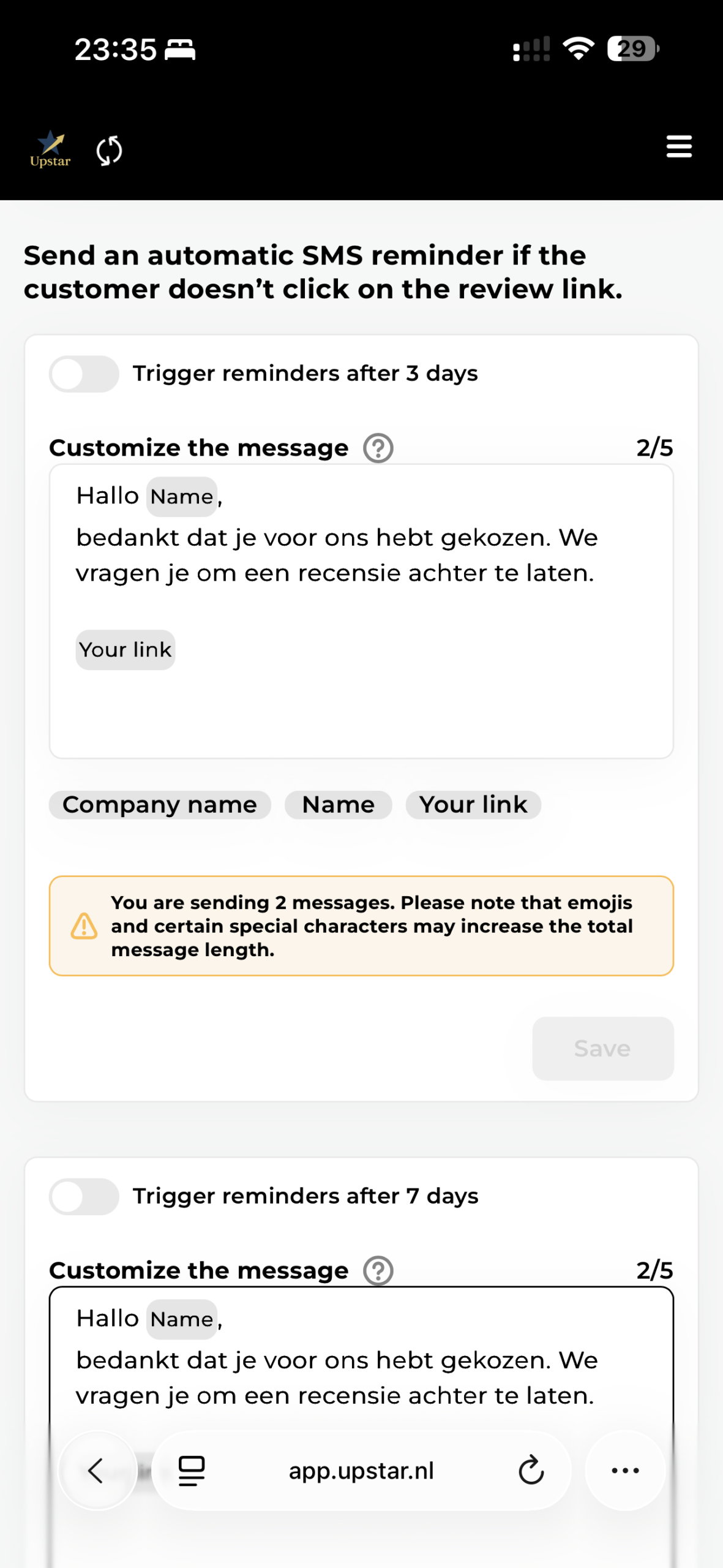 Upload eenvoudig je klantenlijst en stuur naar honderden mensen tegelijk een sms, whatsapp bericht of email met de vraag of ze je kunnen beoordelen