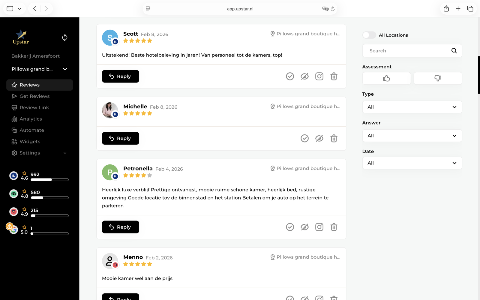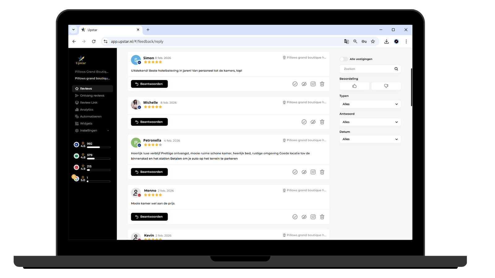Bekijk alle binnengekomen reviews van meer dan 55+ platforms op 1 scherm. Reageer eenvoudig en laat klanten weten dat je ze serieus neemt!